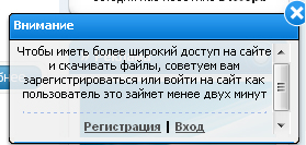 Просилка регистрации для ucoz через аякс в правом нижним углу с возможность закрытия + автоматическое закрытие. Преимущество скрипта: + 20% зарегистрированных юзеров на вашем сайте. w:265 - Ширина h:112 - Высота tm:20000 - время через которое окно само закроется (1000 = 1сек.) В любое место можно в блок: